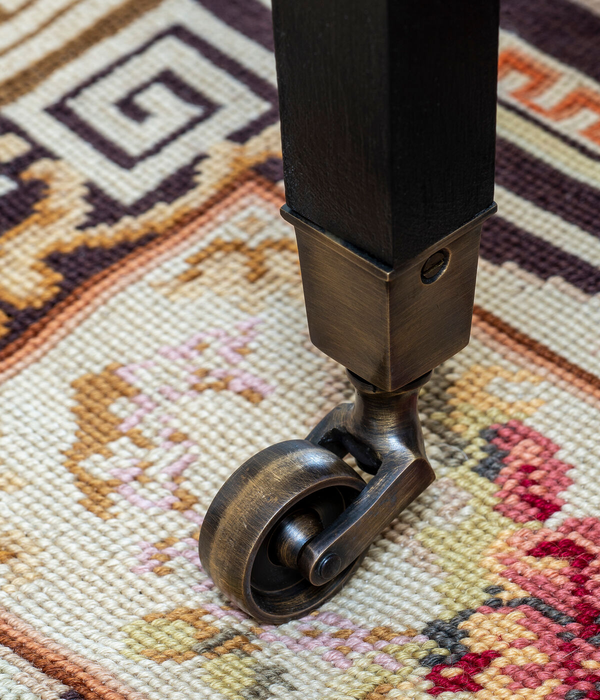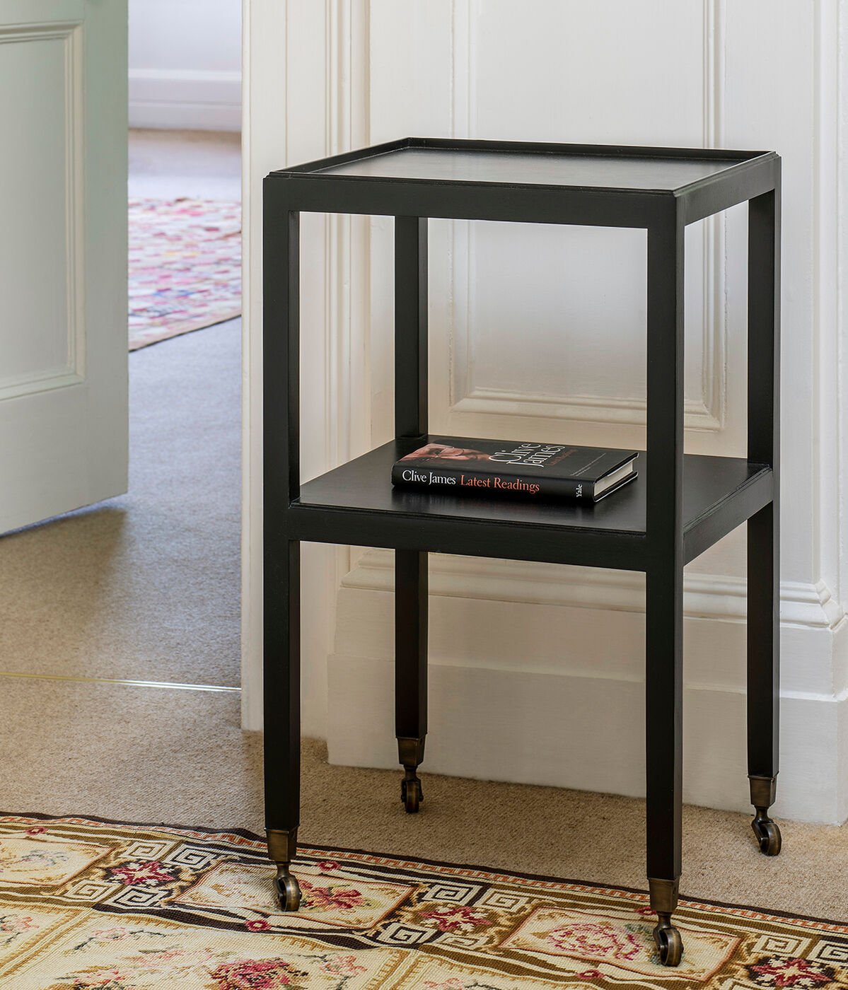 A striking design, this side table is composed of two tiers. and is neatly finished with antiqued brass castors. A classic piece, based on an early 19th century antique, it stands out with its crisply defined lines and tapered legs.