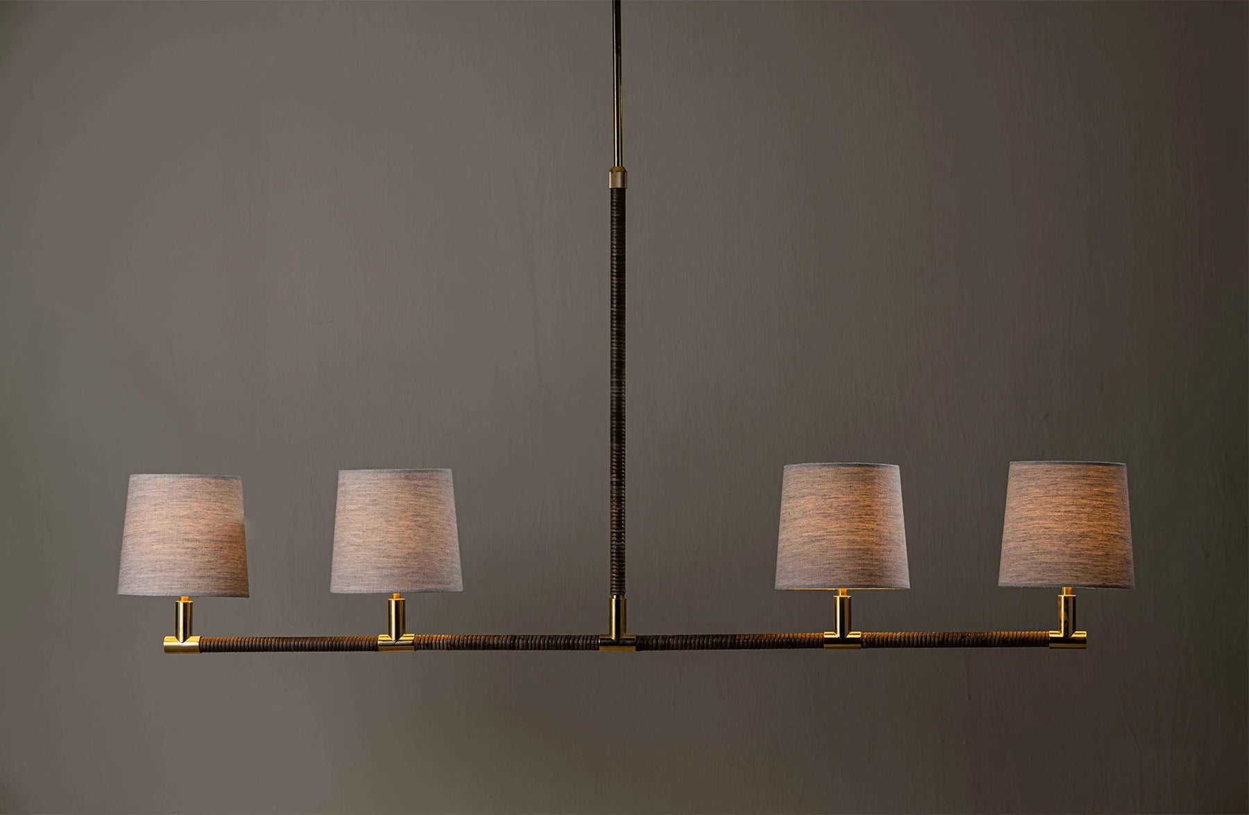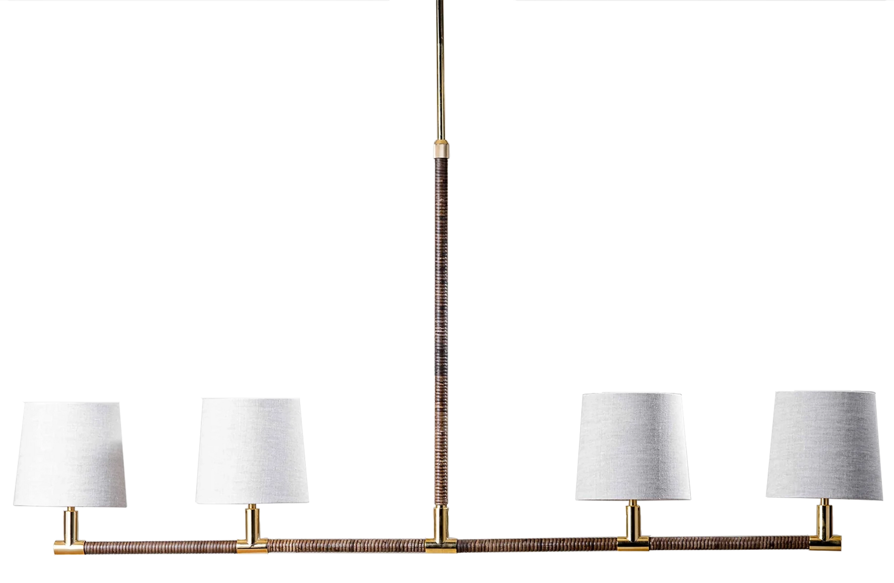 The Holden Linear Pendant Uplighter is formed of natural materials. The cane that wraps around the piece has subtle markings that have been maintained throughout the making process. This piece has four lights and is perfect for hanging over Islands or dining tables.