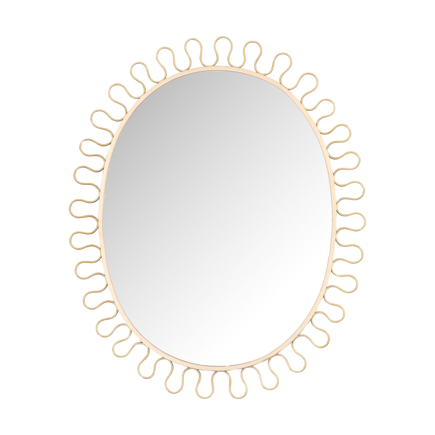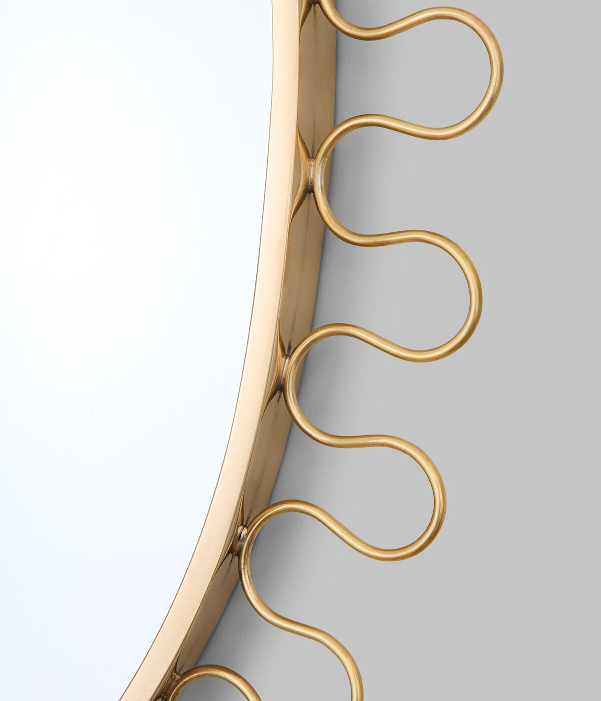 The Exton Mirror is fabricated from shaped brass rod and mirror. The curved brass detailing adds a contemporary look to this 20th century style piece. Also available in oval or rectangular shape.