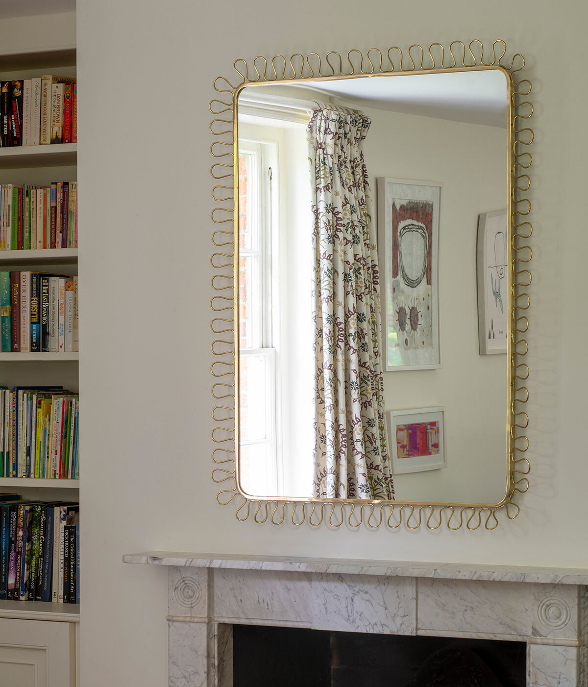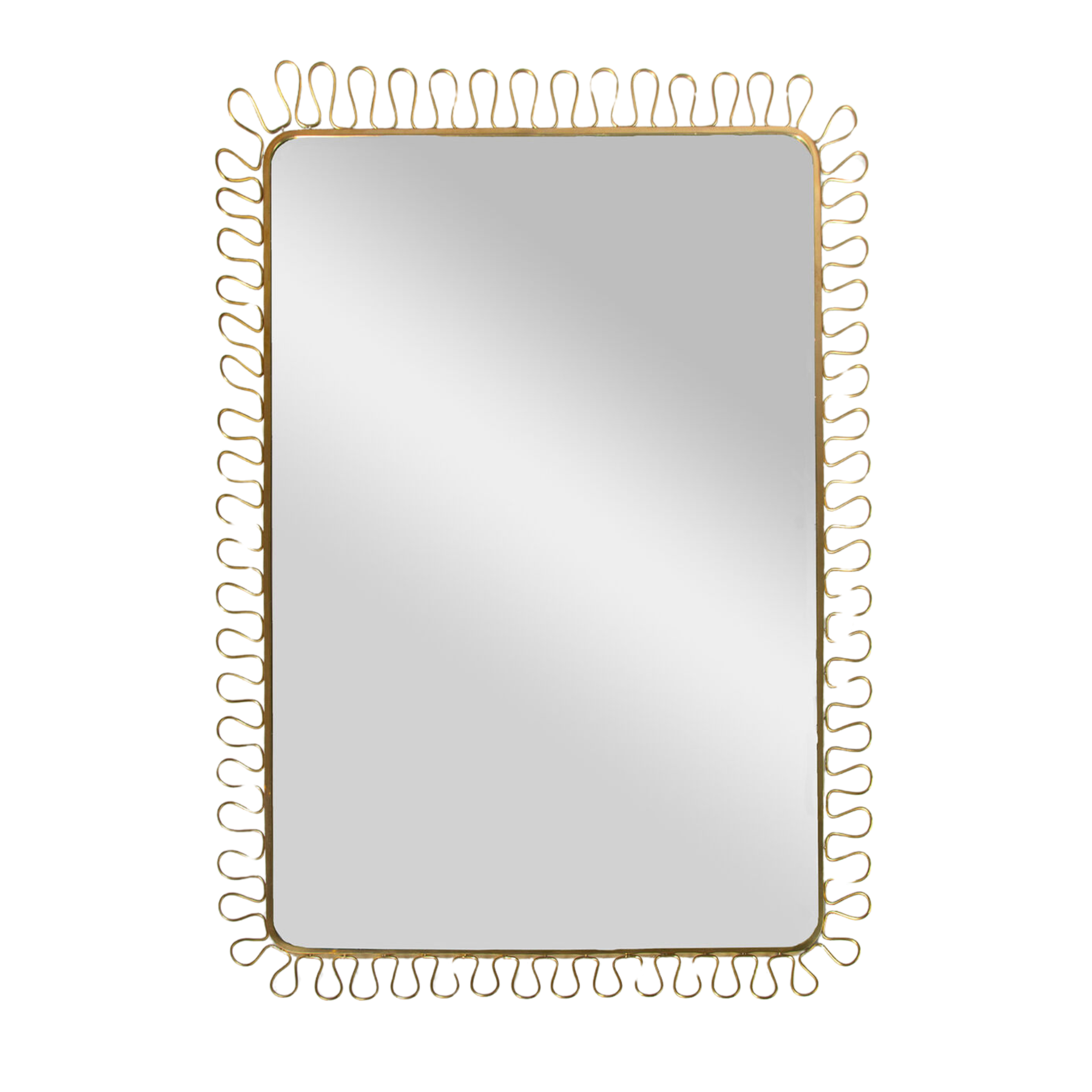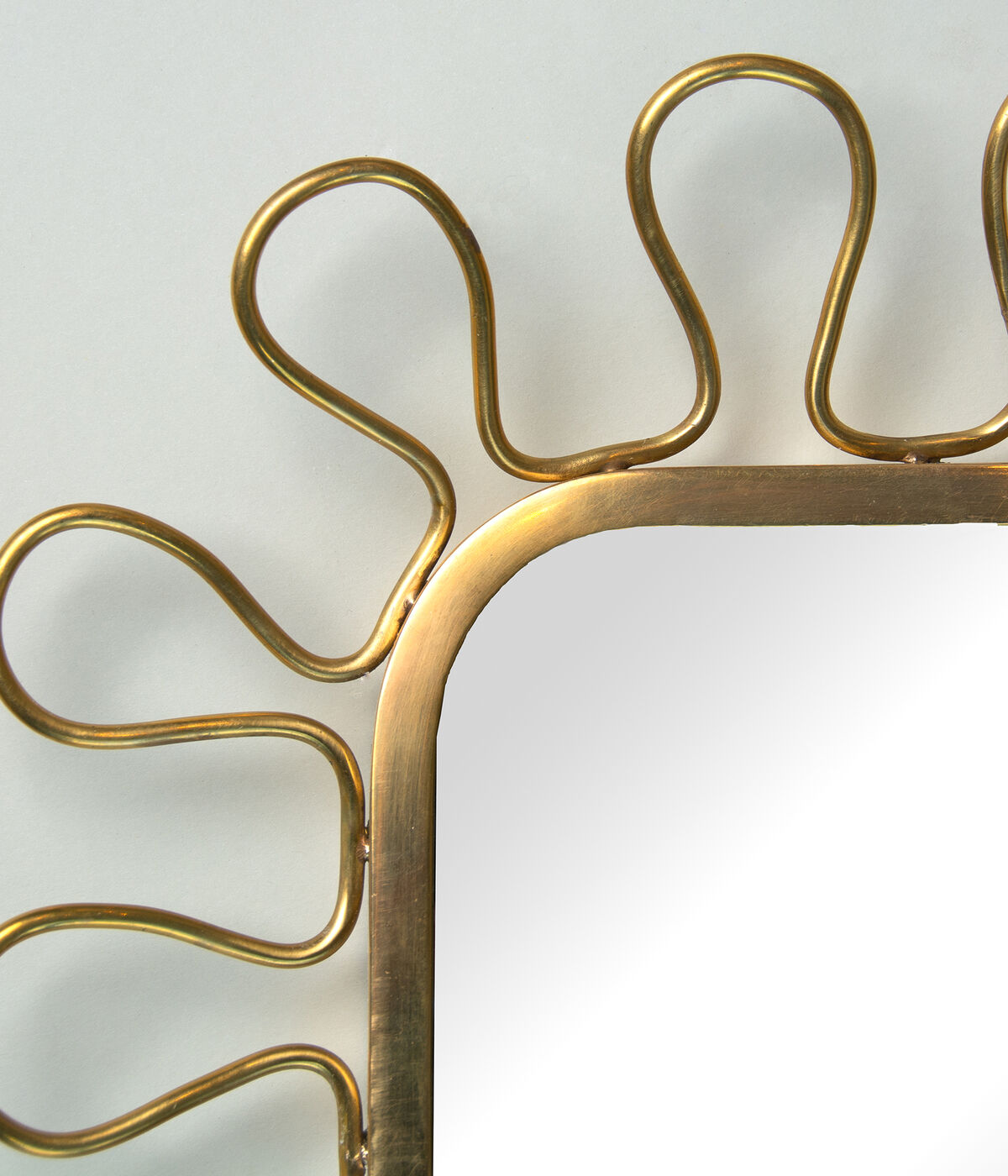 The Exton Mirror is fabricated from shaped brass rod and mirror. The curved brass detailing adds a contemporary look to this 20th century style piece. Also available in oval or rectangular shape.