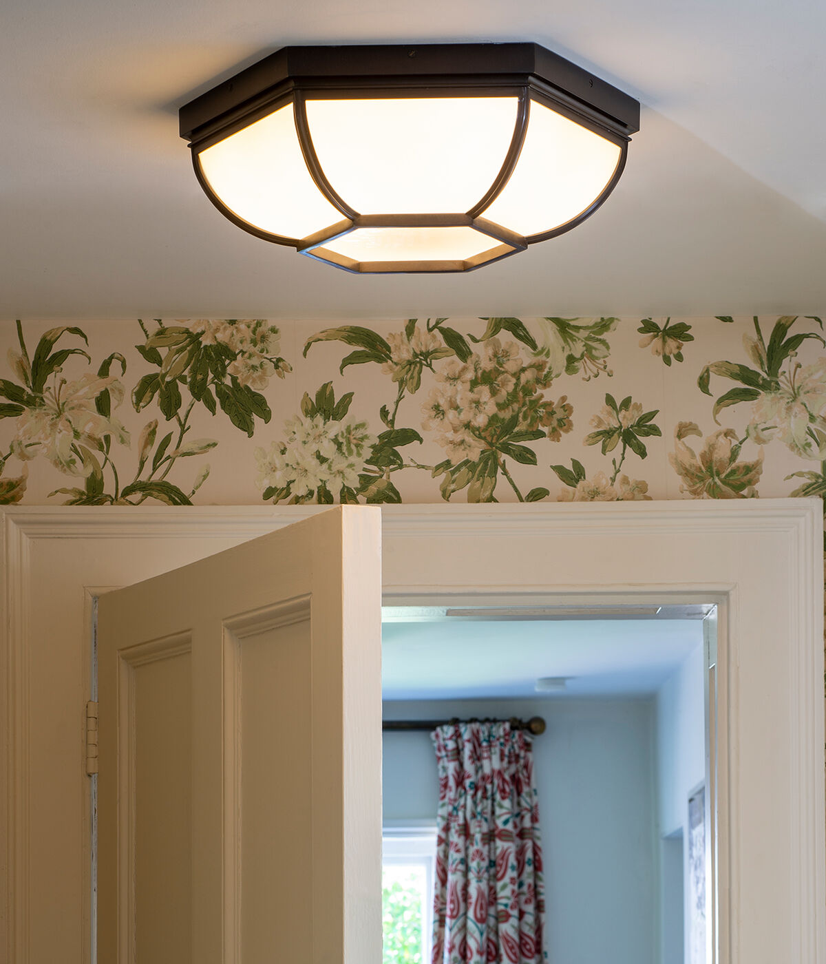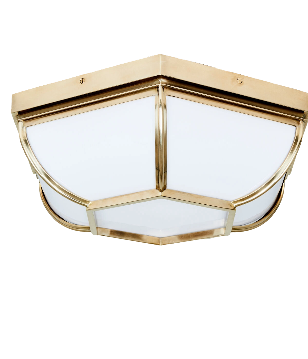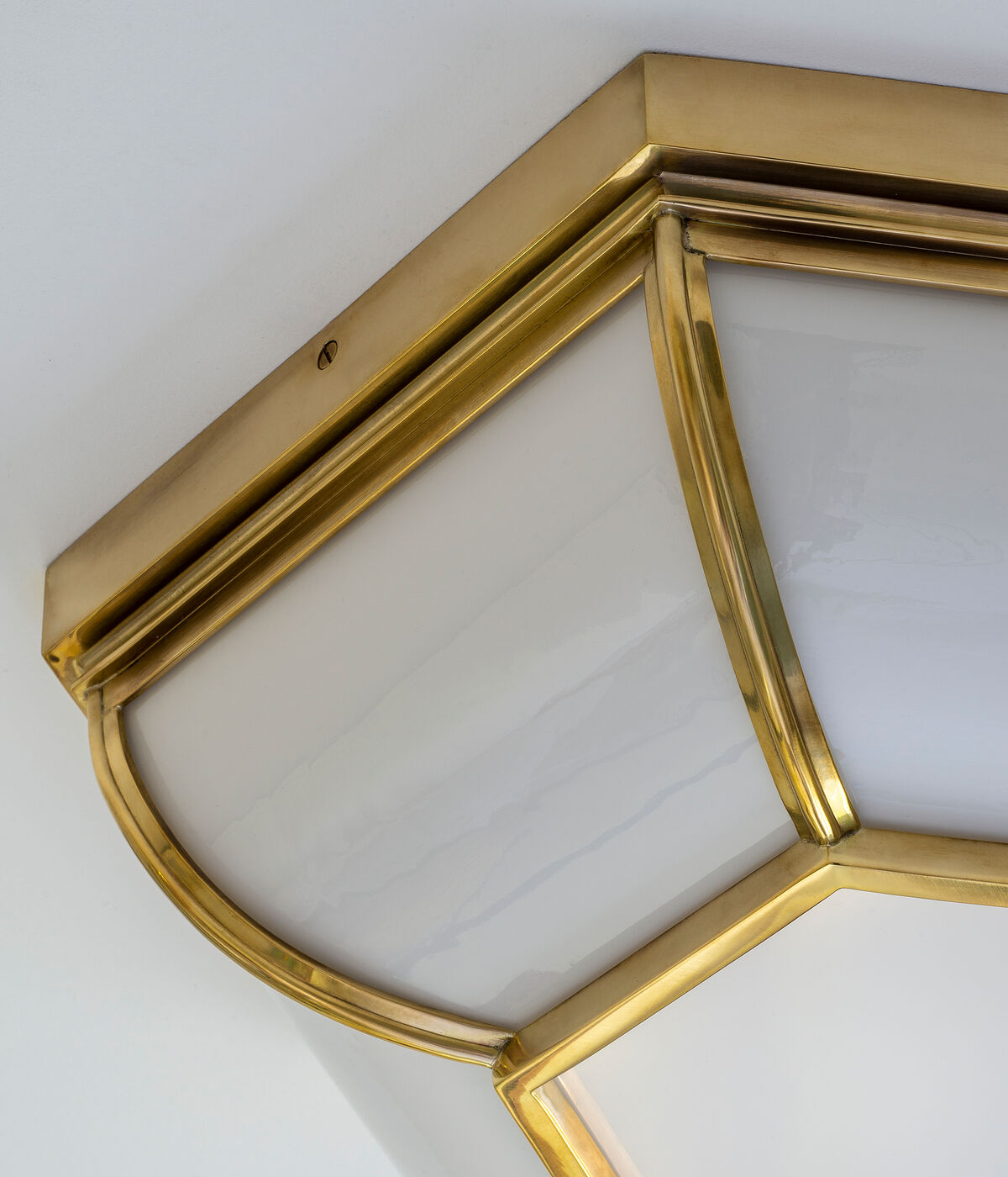 The Pennington Flush Ceiling Light is made from cast brass and machined brass components with an opaline glass inner shade.
